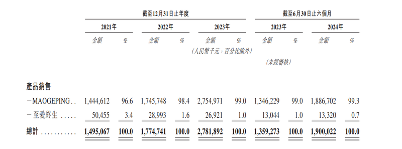 数据显示,今年上半年MAOGEPING的产品销售收入为18.87亿元,占公司产品销售总收入的99.3%,至爱终生的占比仅为0.7%。2021年至2023年,MAOGEPING的产品销售收入分別占公司产品销售总收入的96.6%、98.4%和99%,至爱终生的占比分别为3.4%、1.6%和1%。与此同时,MAOGEPING的毛利率在2021年至2023年以及2024年上半年分别为86.1%、85.6%、85.8%以及85.5%。