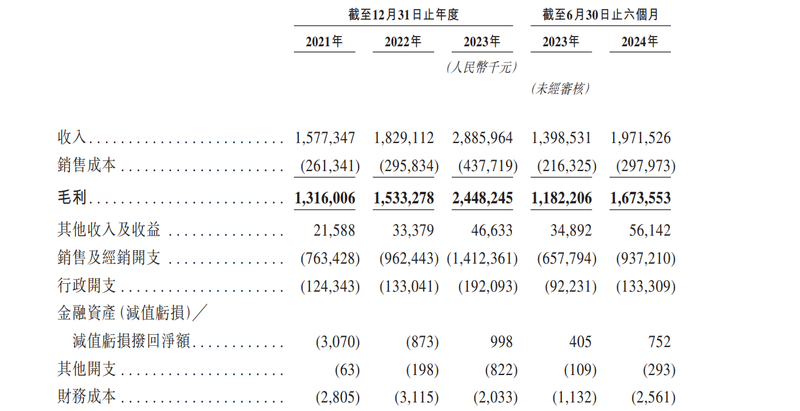 财务数据显示,2021年至2023年,毛戈平分别实现收入15.77亿元、18.29亿元以及28.86亿元,复合年均增长率为35.3%;净利润分别为3.31亿元、3.52亿元和6.64亿元,复合年均增长率达41.6%。今年上半年,该公司收入同比增长41%至19.72亿元,2023年同期为13.99亿元;净利润从去年同期的3.49亿元增加41%至4.93亿元。