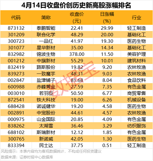 20只个股今日收盘创历史新高20只个股今日收盘创历史新高