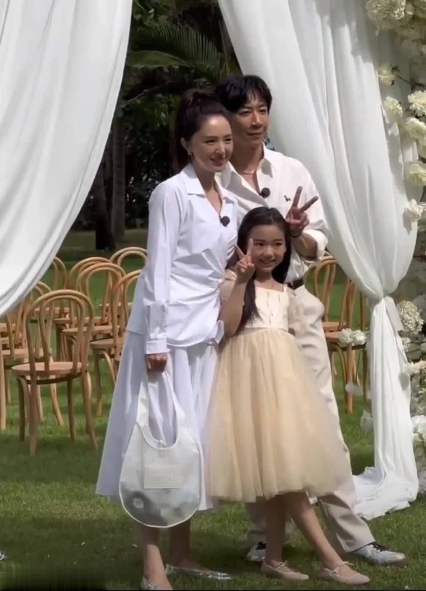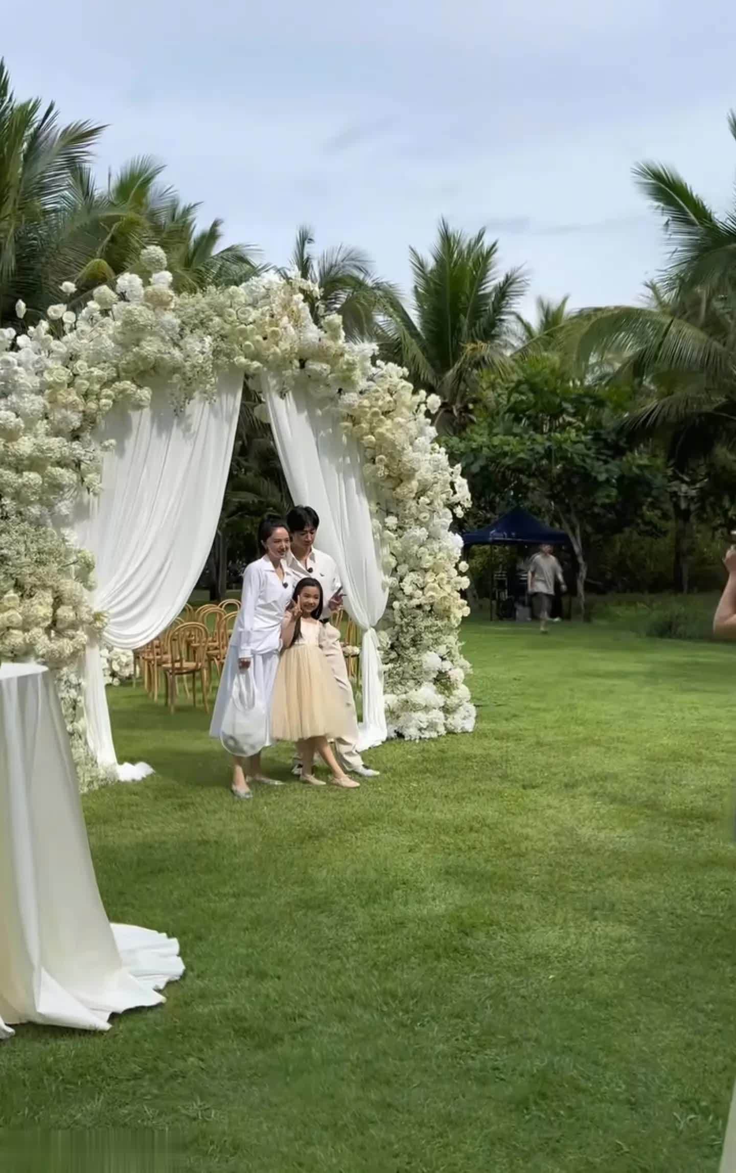 这应该是这个婚礼策划在为别人拍摄结婚照片,而董璇和张维伊不知道是过来参加婚礼,还是碰巧路过,反正就是看到拍照的以后就拉起女儿,一起在鲜花门前拍了张相。
