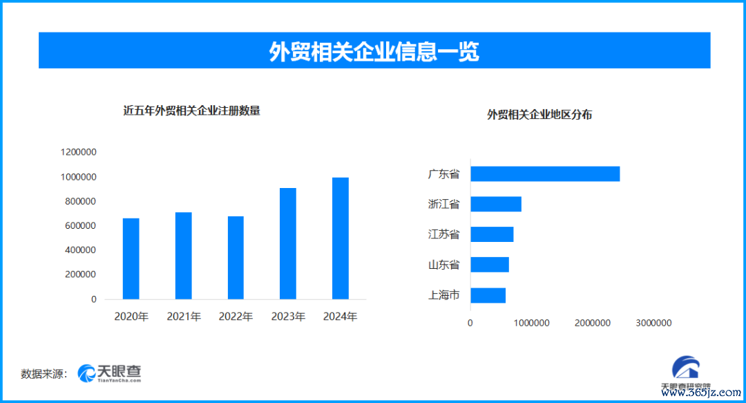 天眼查专业版数据显示,截至目前我国现存在业、存续状态的外贸相关企业超826.2家。其中,2025年截至目前新增注册相关企业约48.1万余家,从企业注册数量趋势来看,近五年间,除2022年稍有下降外,外贸相关企业的注册数量呈现出逐年增长的态势,并在2024年达到顶峰。
